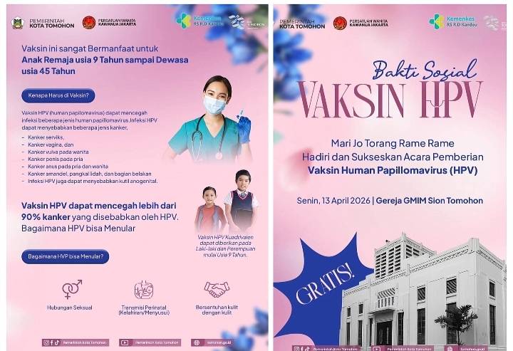 Diketahui, Bakti sosial vaksin HPV ini, akan dilaksanakan di lokasi Gereja GMIM Sion Tomohon, Senin (13/04/2026).